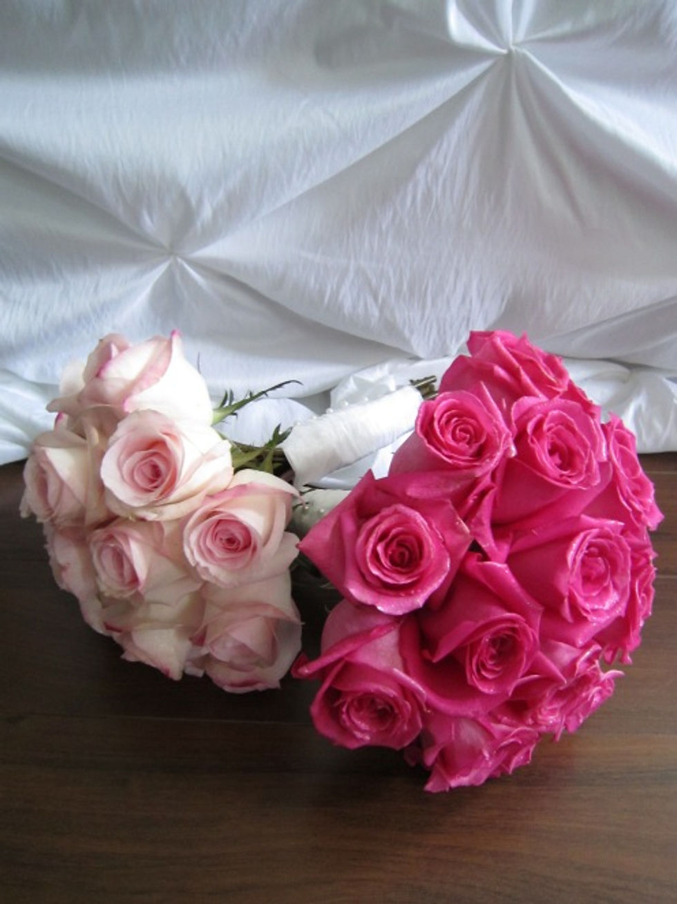 We provided a hot pink rose bouquet for the bride and light pink rose bouquets for the bridesmaids, they had a little bit of hot pink on the tips.
